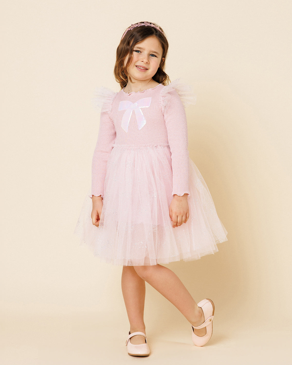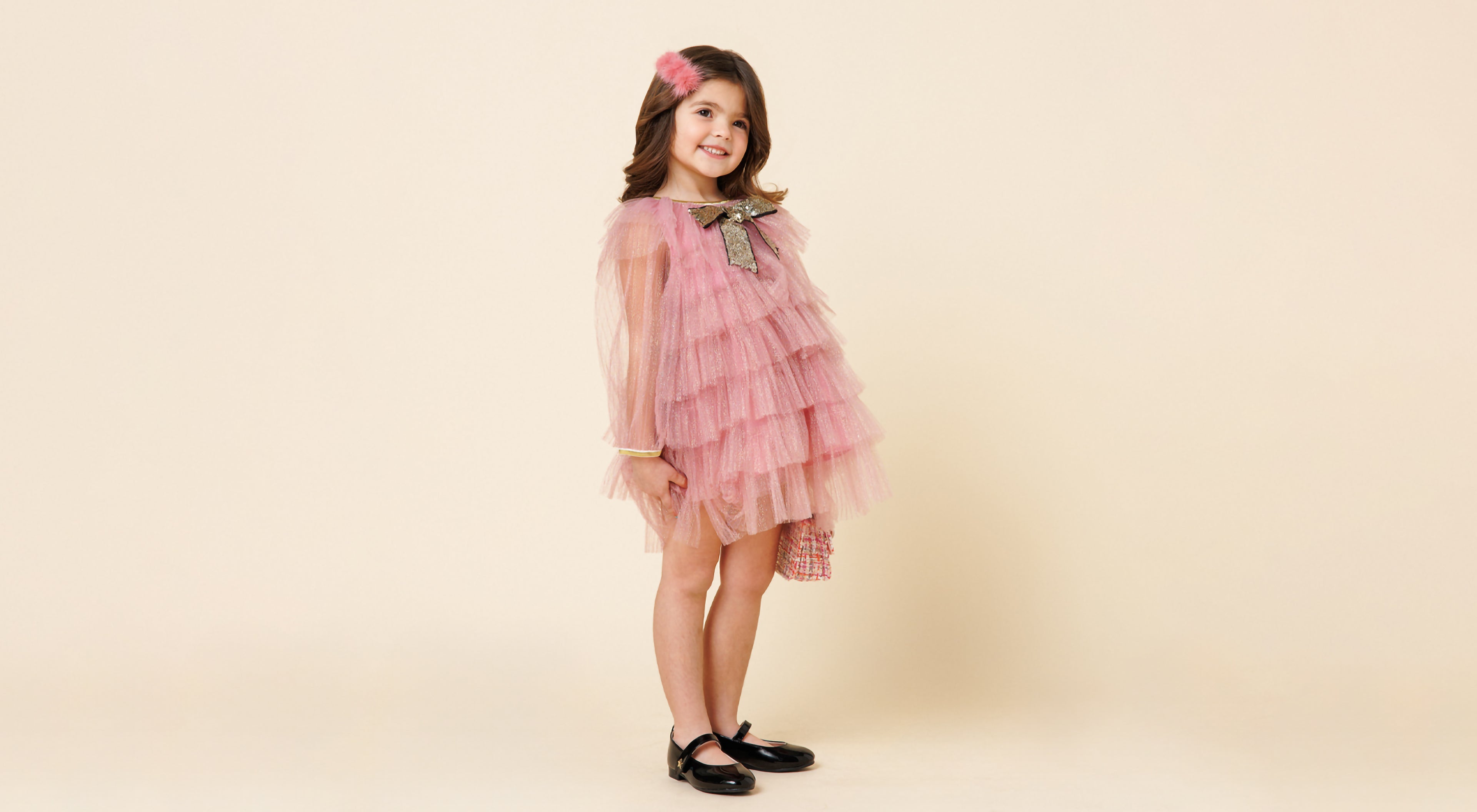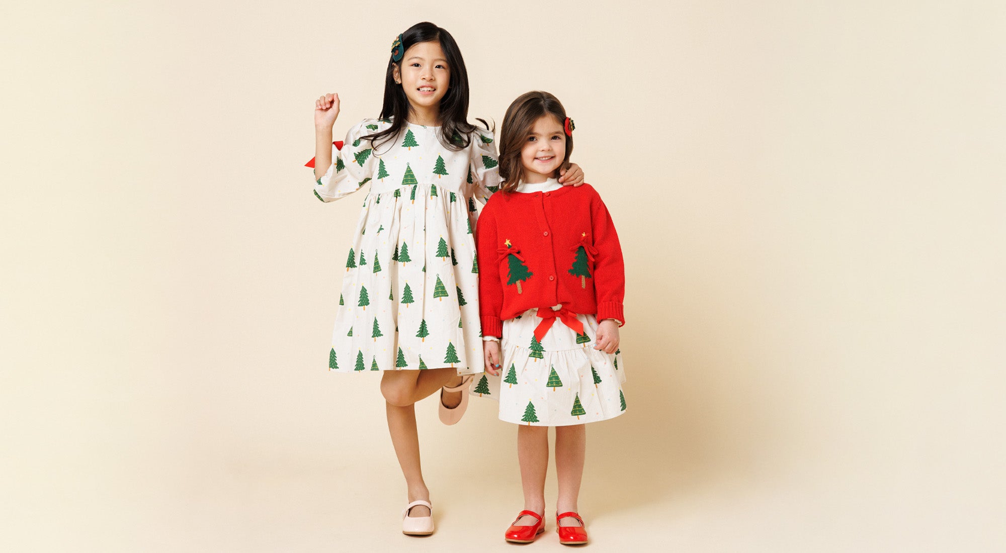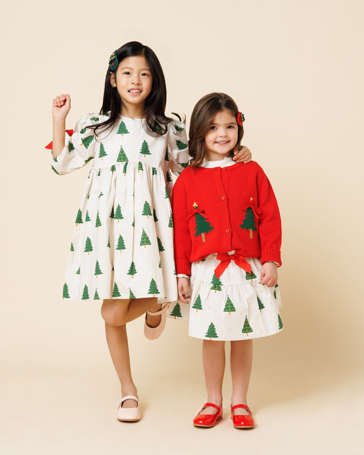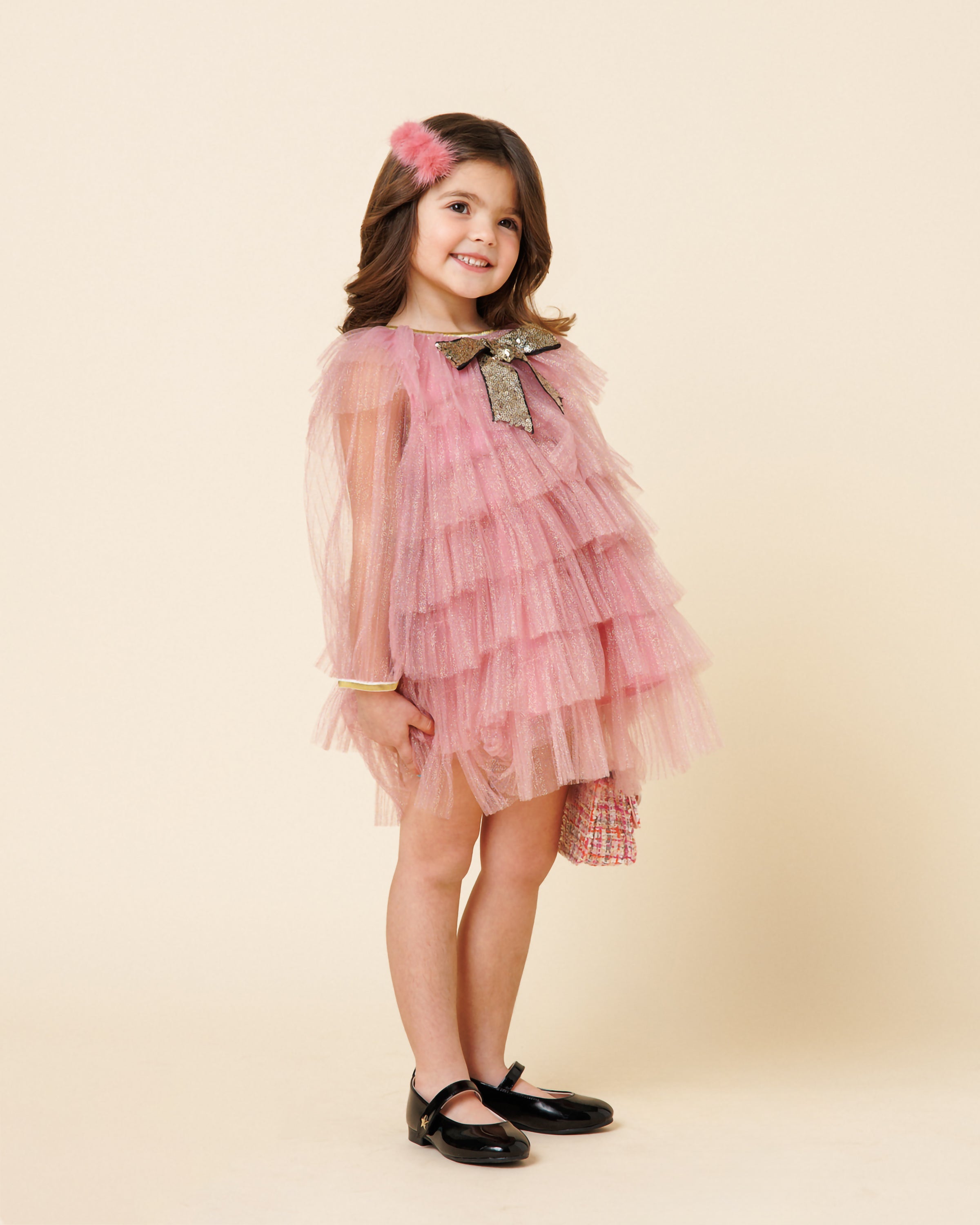 Timeless elegance meets modern charm. Crafted in soft red tweed, this classic silhouette shines with a jeweled bow and a pearl-embellished collar. Perfect for the holiday season.