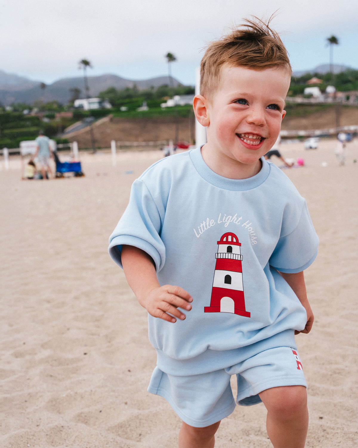Charming two-piece set featuring a sky blue palette with a striking lighthouse design on the top and a coordinating smaller lighthouse motif on the shorts. Perfect for little ones who love nautical-inspired style. The set combines comfort with playful coastal charm, ideal for everyday wear or special occasions.