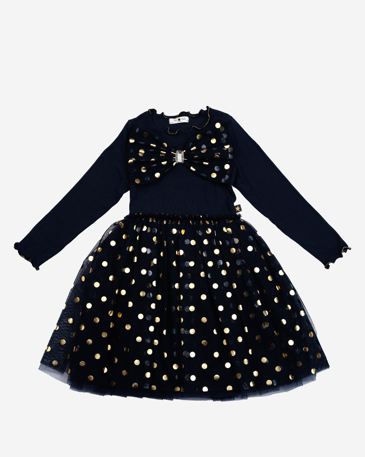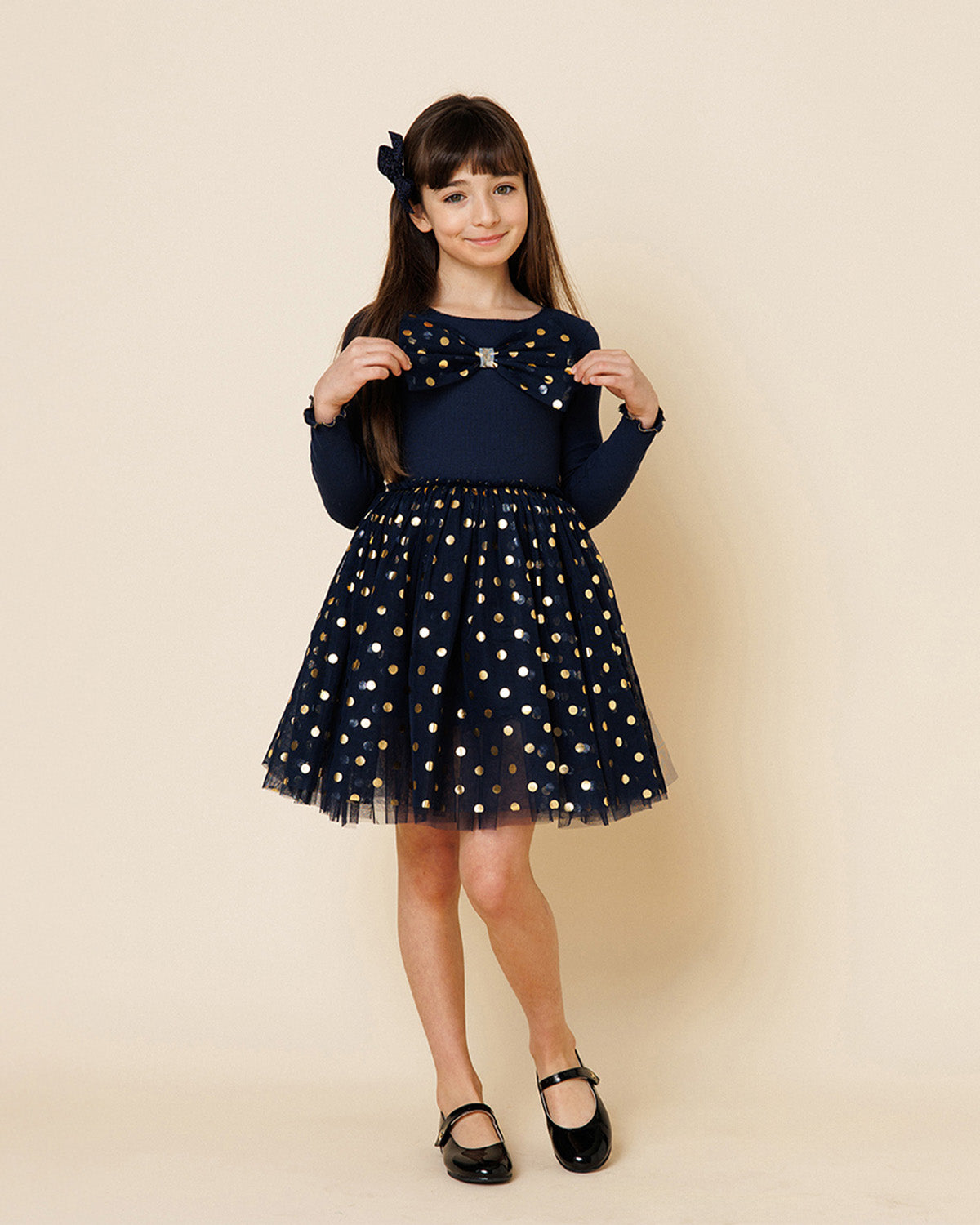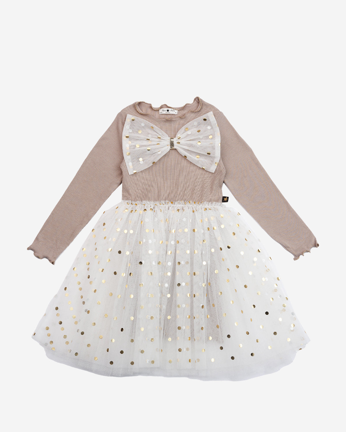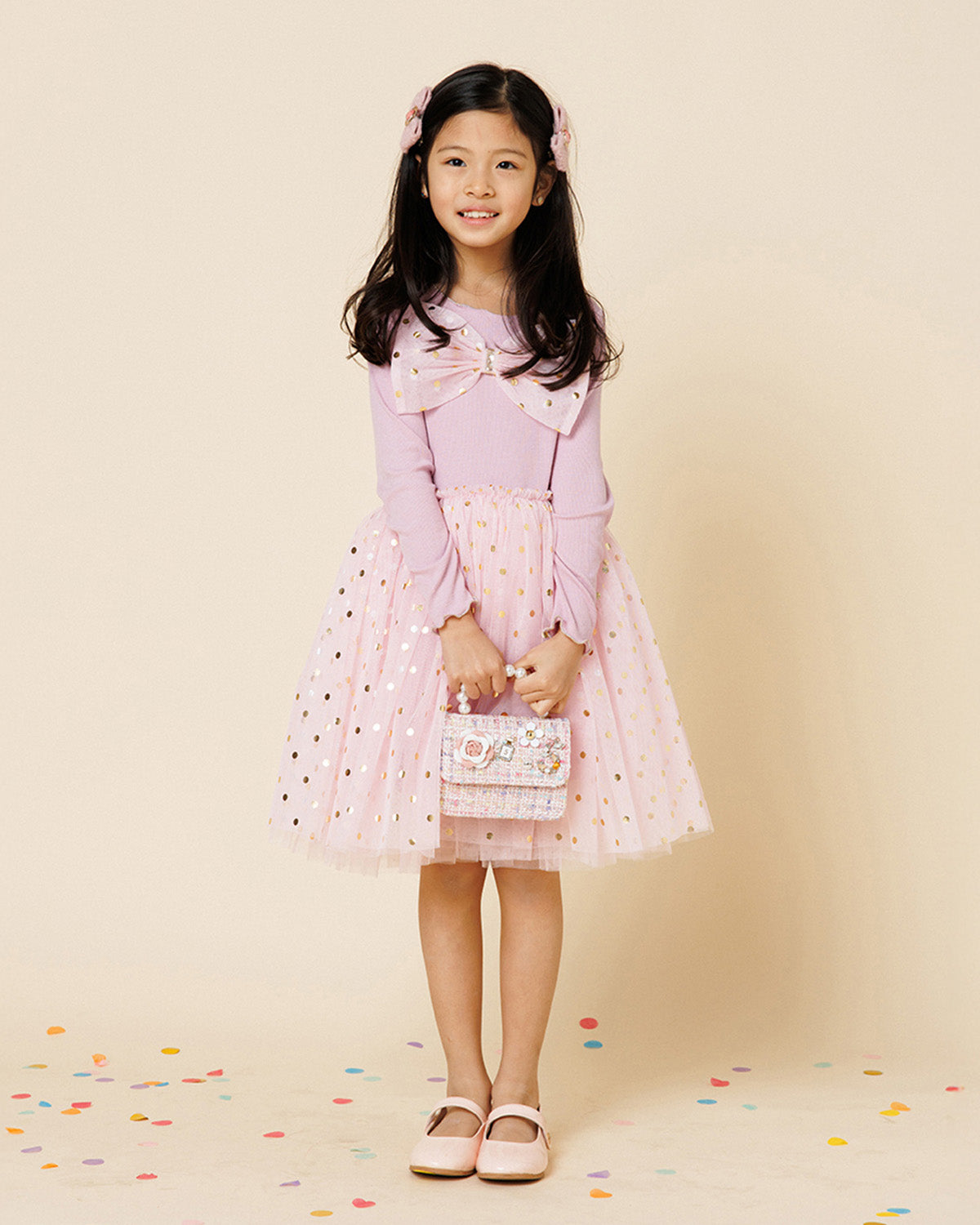 The Gold Dot Bow Tutu Dress is perfect for little girls who love to twirl in style. It features a soft bodice with a sparkling polka dot bow and a layered tulle skirt sprinkled with delicate polka dots, creating a whimsical look. Available in soft pink, this dress is ideal for birthdays, celebrations, or adding a magical touch to everyday moments.
