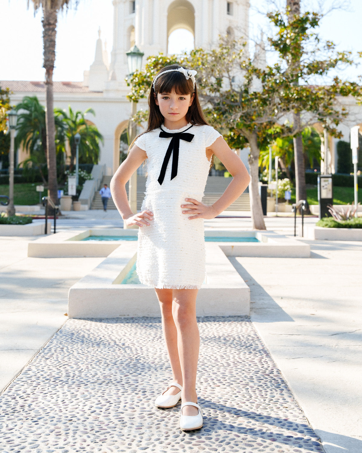 Refined style with a modern twist. The Sofia Tweed Garment Dress is crafted in soft white tweed with a polished silhouette, made just for little girls who love a touch of elegance. This charming dress features shorter sleeves for a lighter feel and a classic black bow accent at the front for simple, standout style. Perfect for special occasions or dressing up just because.