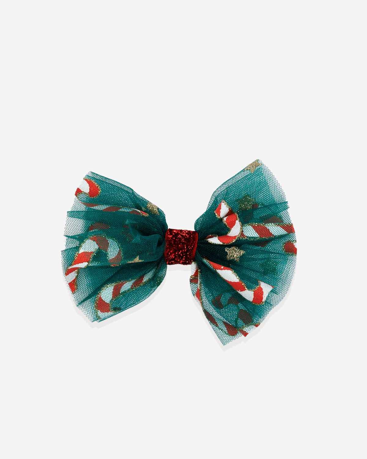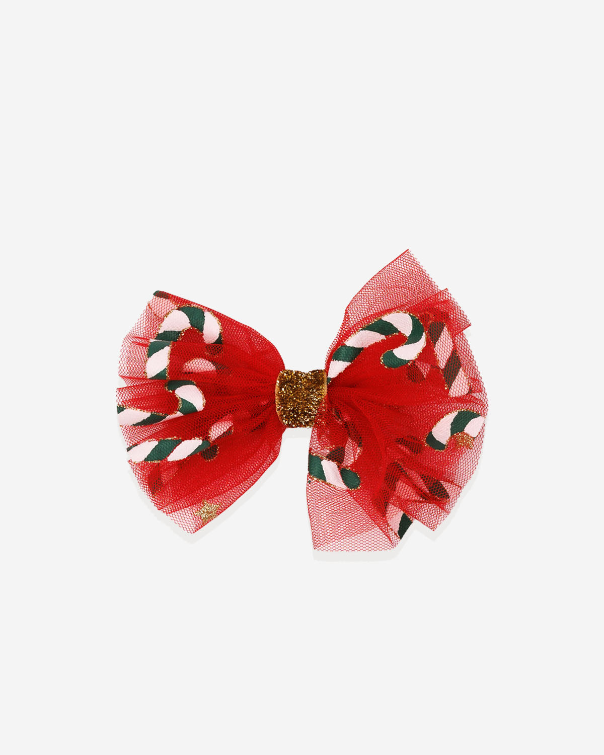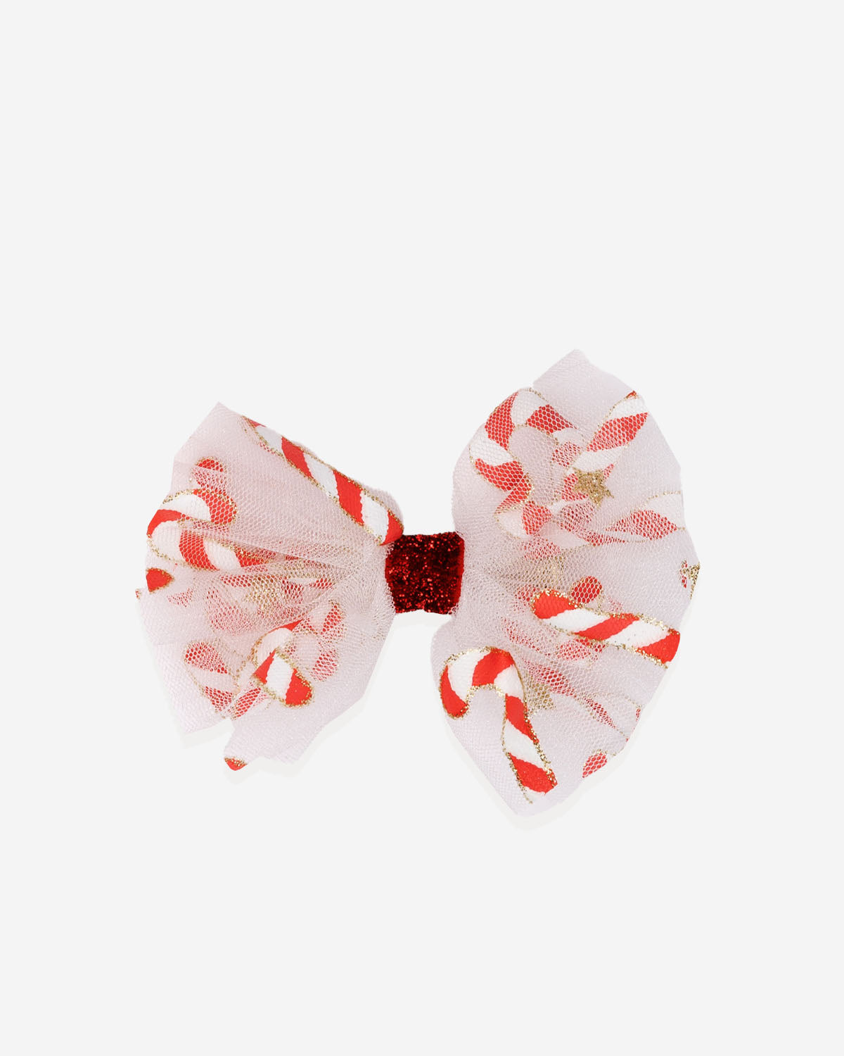 Sweeten up any holiday look with our Candy Cane Tutu Bow. Made of soft, fluffy tulle in classic Christmas colors red, green, and white this bow features charming candy cane accents and a sparkling gold glitter center. Light, festive, and full of cheer, it's the perfect finishing touch for holiday parties, school events, or cozy winter playdates.