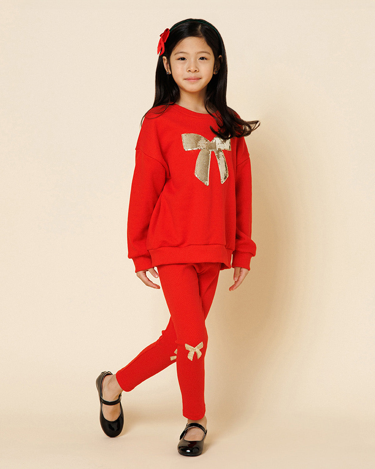 Everyday comfort with a graceful sparkle. Our Lulu Bow Leggings are crafted for little girls who love to move freely without missing a stylish detail. Made from a soft, stretchy fabric that hugs just right, these leggings feature shimmering sequin bows at the knees for a sweet touch of shine. Available in pink, light gray, red, and navy, they pair perfectly with the Lulu Bow Sweatshirt or her favorite tee. A charming essential for playdates, parties, or quiet days at home.