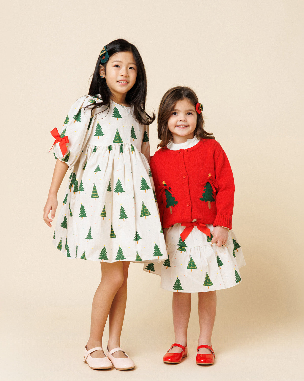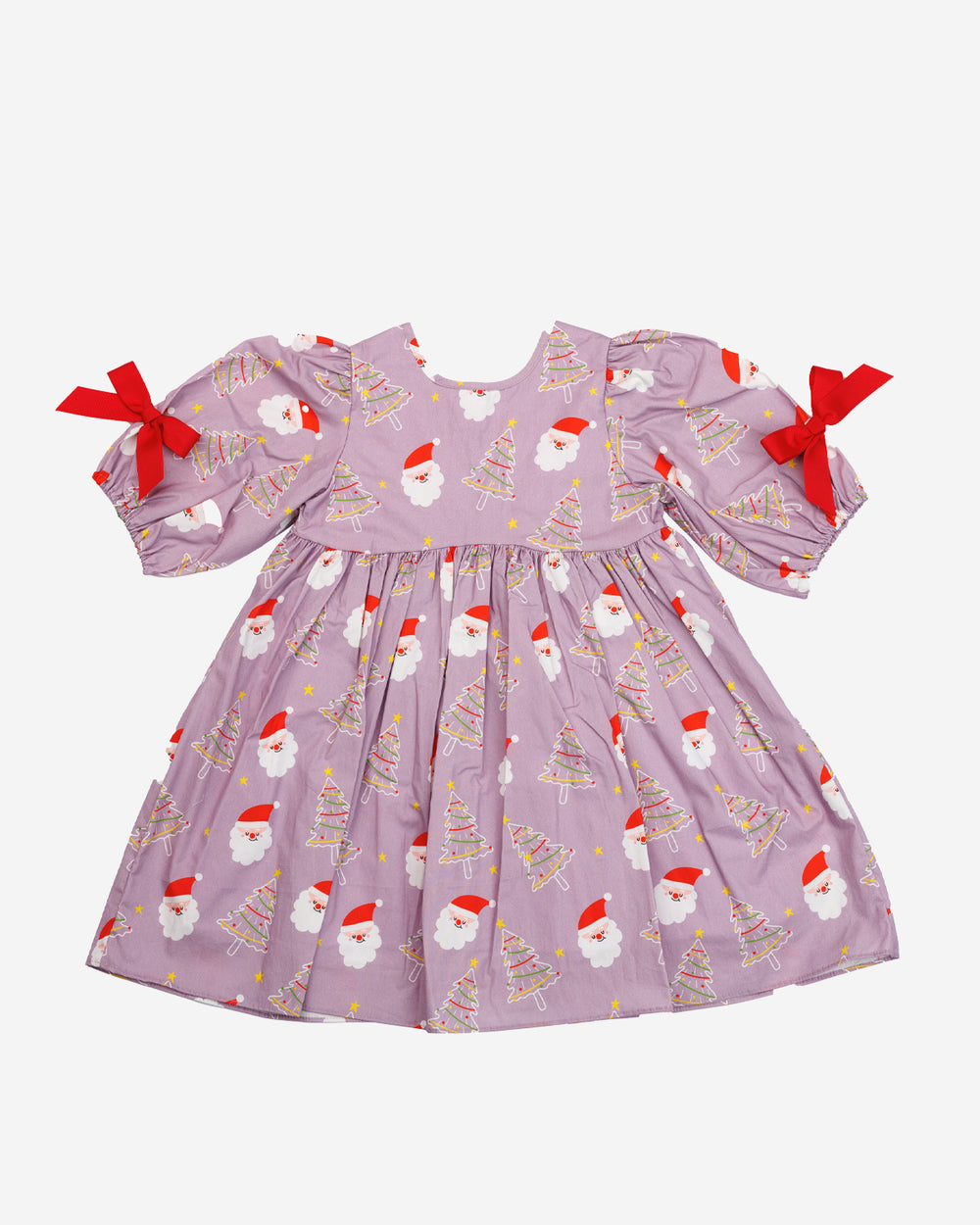 Bring holiday magic to every twirl. Our Printed Balloon Dress is full of festive charm, featuring an allover Christmas tree print with colorful accents. Puffy balloon sleeves tied with bright red bows add a playful touch, while the full gathered skirt is perfect for dancing, photos, and joyful celebrations. Soft, comfy, and oh-so-sweet, it’s the dress made to shine at every holiday moment.
