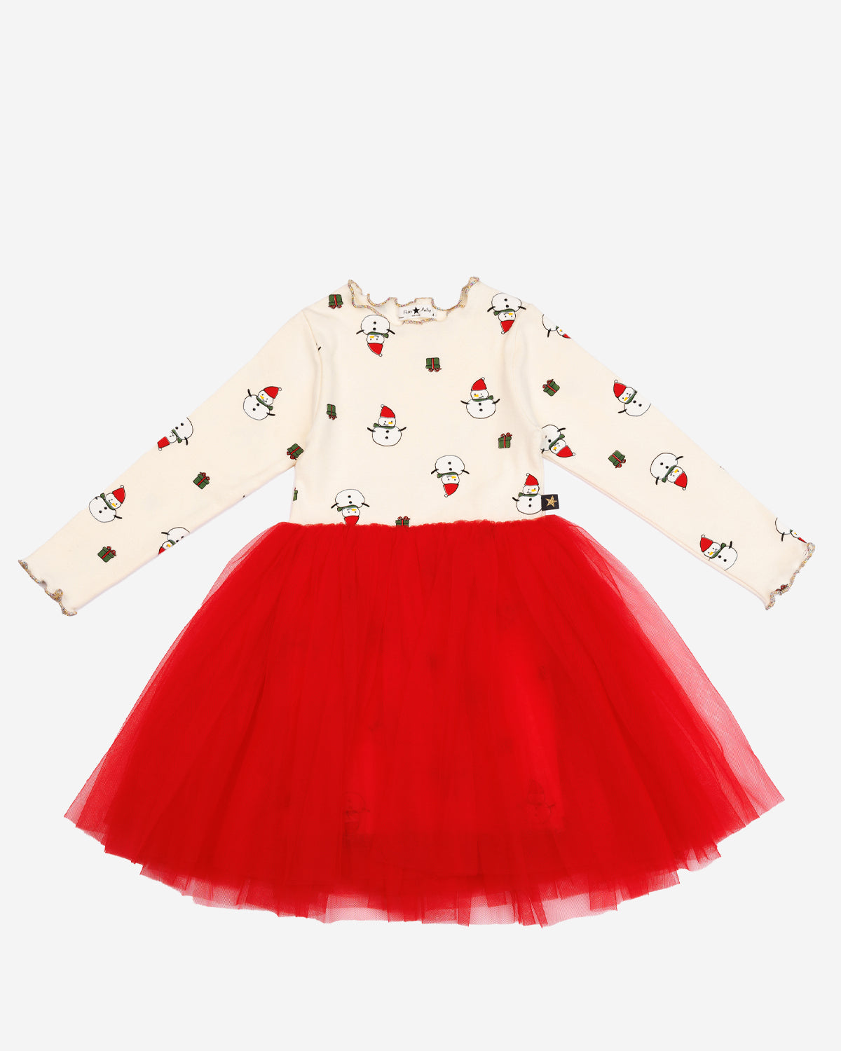 Bring on the holiday joy with our Snowman Tutu Dress! The soft knit top features playful snowman and present prints, paired with a fluffy red tulle skirt made for twirling. Finished with sweet ruffle trim at the collar and sleeves, this merry little dress is perfect for parties, photos, and all the magic of the season.