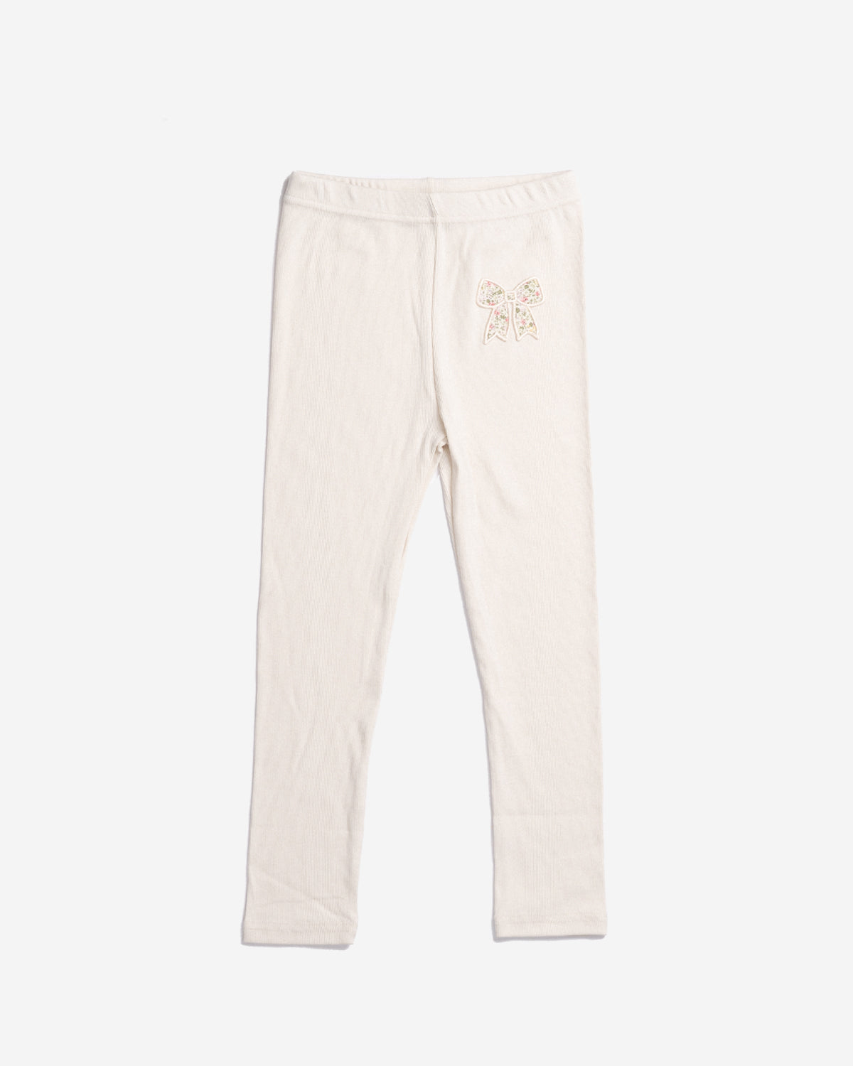 Our Sophia Bow Leggings in Ivory are a sweet essential designed for everyday comfort with a delicate, feminine touch. Crafted from soft, stretchy ribbed fabric, these leggings provide a cozy, flexible fit that moves easily through play, lounging, and outings. A charming floral bow appliqué adds a subtle statement detail, while the neutral ivory tone makes them effortlessly versatile for pairing with dresses, tees, or sweaters. Perfect for layering year-round, these leggings blend comfort, style, and softness in one timeless piece.