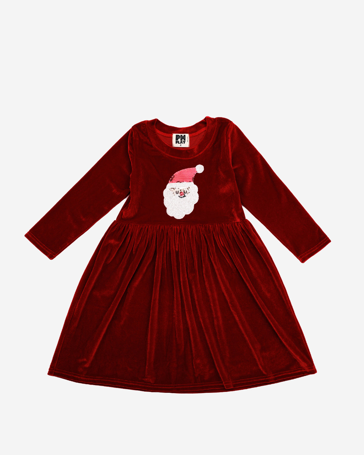 Bring on the holiday cheer with this festive favorite! Crafted in rich red velvet, the Velvet Santa Dress features a sparkling sequin Santa motif that adds the perfect touch of Christmas magic. With its soft, cozy feel and twirl-worthy skirt, it’s made for holiday parties, photos, and every merry moment in between.